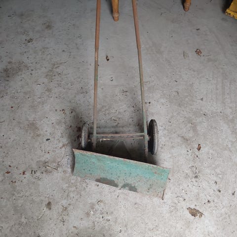 Ældre sneplov i metal med langt skaft og godt håndtag.