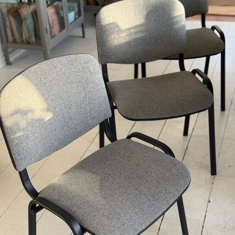 stol med sort laminat sæde og ryg. Stolen har ben i forkromet stål og er velegnet til brug i forskellige indendørs miljøer. Designet til at være stabil og nem at stakke for opbevaring.