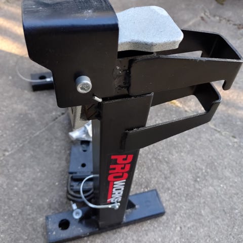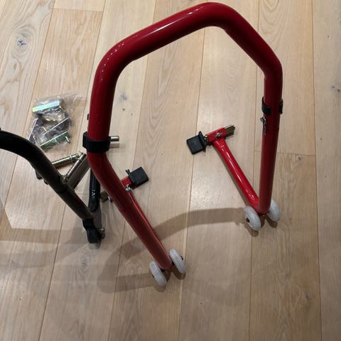 Bike-Lift motorcykelstøtte i rød farve. Designet til at støtte motorcykler ved vedligeholdelse eller opbevaring. Fremstillet i robust materiale med hjul for nem bevægelse.