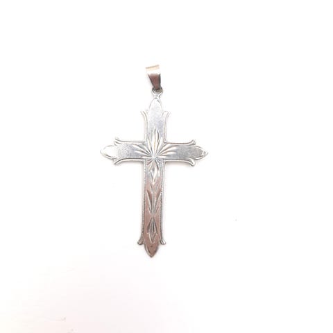 Et flot sølv vedhæng med kors dekoreret med bladværk og oxyderet stemplet 830S S.A.V. Designeren hedder Scandia Affinerings værk fra København og startede i 1943. Vedhænget måler 5,5 x 4,5 cm uden øsken og fremstår i fin vintage stand.