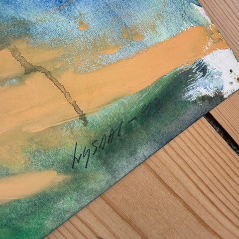 Abstrakt maleri Akvarel med levende farver, af Ivy Lysdal, signeret Lysdal og dateret 1993. Maleriet indeholder nuancer af grøn, blå, gul og pink, og er udført med en ekspressiv penselstrøgsteknik.