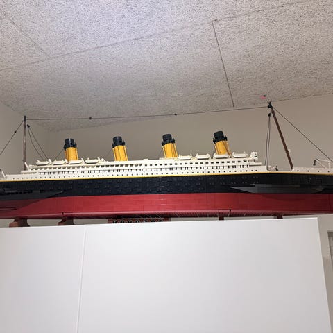 LEGO System Kronprins Frederik skib legetøj med detaljeret design, herunder hvid og sort farve med røde og sorte skorstene. Modellen inkluderer små køretøjer og en manual. Egnet til samling og leg.