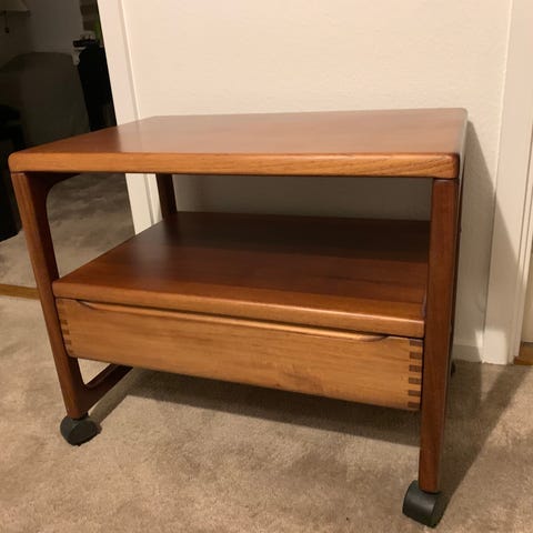 rullebord med en øverste bordplade og en nederste hylde. Bordet er fremstillet af materialer med en lys overflade og har hjul for nem mobilitet. Designet til generel opbevaring og transport af genstande i hjemmet eller på kontoret.