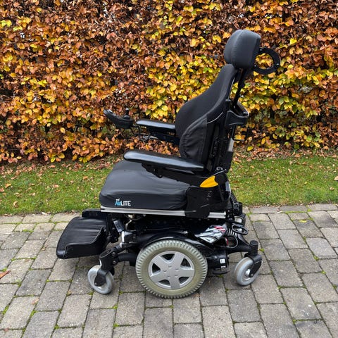 Invacare elektrisk kørestol med sort polstret sæde og ryg, letvægtsramme i metal, fodstøtte og joystick-styring. Designet til brugere med behov for elektrisk mobilitetshjælp, egnet til både indendørs og udendørs brug.