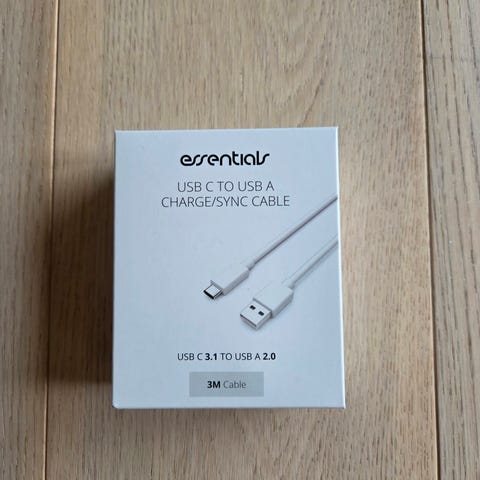 Nyt/ubrugt USB A - USB C opladerkabel i hvid. Kablet har en længde på 3 meter og kan bruges til opladning og dataoverførsel mellem enheder med USB A og USB C porte.