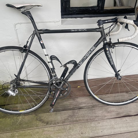 Virkelig flot og velholdt racer i carbon/aluminium. Størrelse 50 målt fra center krankboks til center overrør. Fuld Ultegra 10 speed gruppe. Easton ec90 Carbon hjul til lukkede ringe. Den ene ring er flad, styrbåndet er slidt og cyklen er lidt beskidt af at stå mange år i en kælder.