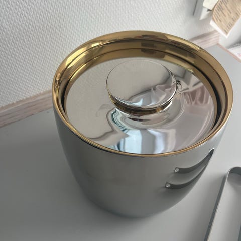 Smuk Stelton champagnekøler/isspand – med blanke overflader og gyldne detaljer indvendigt. Med et rumfang på 3 liter. Køleren har dobbeltvægge, hvilket betyder at den holder på kulden i længere tid og kondensdannelse på ydersiden reduceres. Design af Lord Norman Foster for Stelton. I fin stand og med minimale brugsspor. Kan sendes på købers regning.