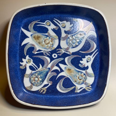Royal Copenhagen nr 3277. Skålen/ askebægeret har en diameter på cirka 20 cm og er fremstillet i glaseret porcelæn med blå og beige farvetoner.