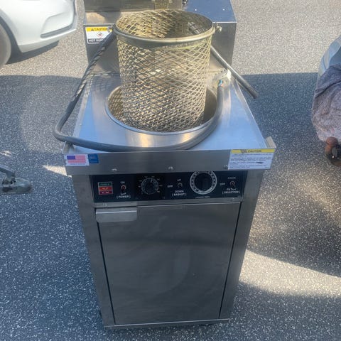 Giles Enterprises CF-300 frituregryde i rustfrit stål med kurv til frituremad. Udstyret med justerbar temperaturkontrol og effekt på 12 kW. Velegnet til kommerciel brug i køkkener og restauranter.