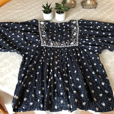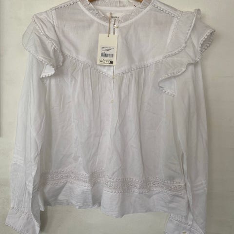 Meget smuk skjortebluse med blonder og flæser. Lukkes med knapper i ryggen. Det er en str. 36, men passer vist fint både xs, s og m.