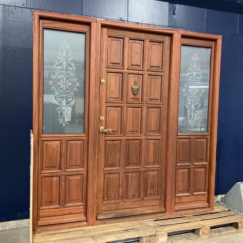 Brugt Mahogni Yderdør, træ/træ, 2 lag glas, hårdttræsbundstykke, håndtag og nøgle medfølger ikke Varenummer: 1171