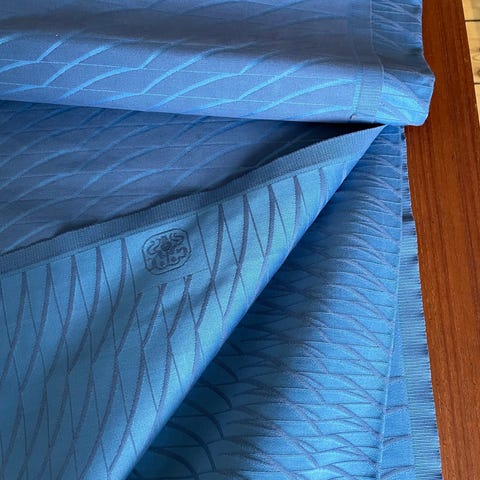 Dug, Georg Jensen, Flot du i blå farve måler 180x160 med mønster design Vibeke klint. Fremstår ny og medfølger 6 servietter.