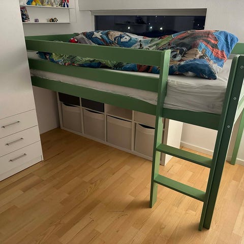Ilva Magne Højseng børneseng i hvid. Designet til børn og velegnet til at spare plads i børneværelset. Sengen har en solid konstruktion med indbygget trappe for nem adgang. Har lidt brugsspor. Model billede