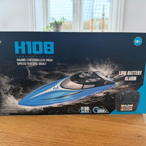 Jet Pump Boat fjernstyret båd i hvid farve. Modellen har en sikker jet pumpe uden eksponeret propel, hvilket øger sikkerheden under brug. Egnet til udendørs brug på vand. Båden er aldrig brugt.