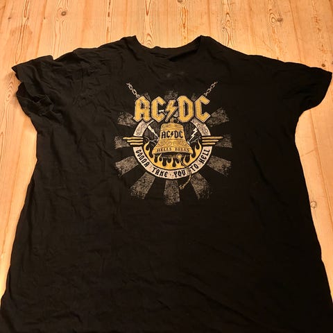 Sort AC/DC T-shirt med et tryk af bandets logo og en kanon. Trykket refererer til sangen "For Those About to Rock".