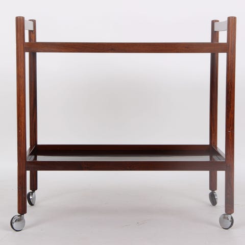 Ole Wanscher rullebord, Rungstedlund-serien, foldebord i mahogni, klapbord med bakker, dansk designklassiker, vintage cocktailbord, serveringsvogn med hjul, barbord i formica og træ, A.J. Iversen, multifunktionelt vintagebord, dansk møbelkunst. krom, mørkt træ, enkel, enkelt, cocktail, cocktailbord, rullebord.