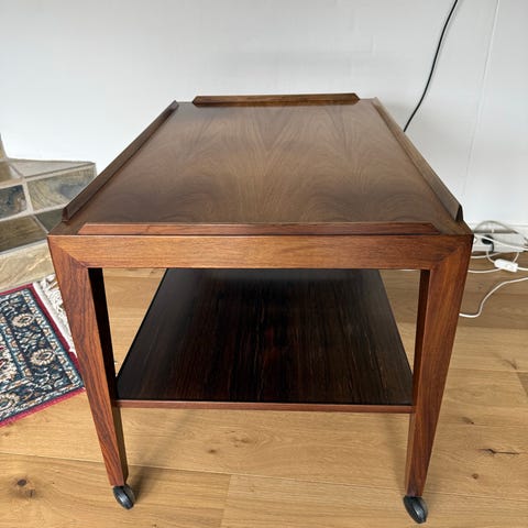 Et sjældent og eftertragtet stykke dansk design: Dette elegante rullebord i massiv mahogni er designet af Ole Wanscher og produceret af A.J. Iversen som del af den eksklusive Rungstedlund-serie. Et møbel, der forener klassisk skønhed med fleksibel funktion, og som i dag regnes som en ægte designklassiker.