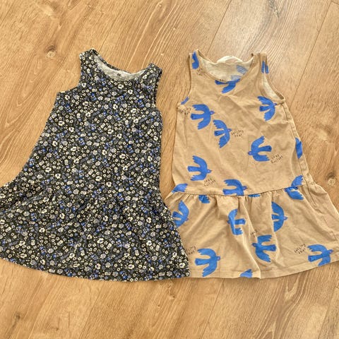 Kjolen har et mønstret design med knapper foran og korte ærmer. Materialet er blødt og velegnet til børn.