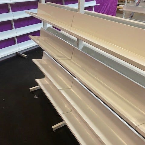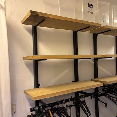 Metal hylde reol til butiksdisplay i hvid farve. Reolen består af flere hylder og er designet til opbevaring og fremvisning af varer i butiksmiljøer. 200 hylder. ( 90 cm bred 16 cm dyb). 40 T-ben (150 cm høj) 24 L-ben (150 cm høj) 11.500 kr. Seriøst bud modtages