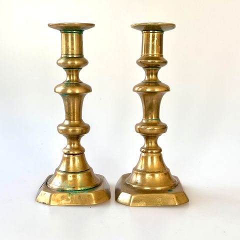 Stagerne er udført med kvadratisk fod (8 × 8 cm), hvilket giver stabilitet og et klassisk arkitektonisk præg. Begge er forsynet med lysskubbere – en praktisk mekanisme, der gør det muligt at hæve stearinlyset, efterhånden som det brænder ned. Denne detalje vidner om den tidstypiske kombination af funktionalitet og raffineret håndværk, som kendetegner victoriansk boligkultur.