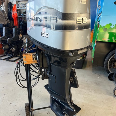 Brugt påhængsmotor årgang 1998. 50hk Powertrim el-start Fjernbetjening med kabler 24 lt. tank.