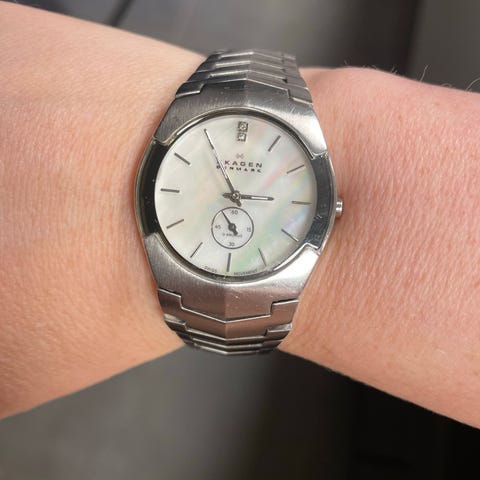 Uret er lavet af rustfrit stål. Selve urskiven er ca. 1 * 2 cm. Uret er stort set aldrig brugt. Uret er Water resistant, hvilket ikke er det samme som Water proof. (se evt foto af bagsiden af uret) Der er sat nyt batteri i juli 2025. Evt små "pletter" er sandsynligvis støv.