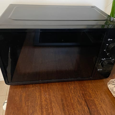Mikroovnen er sort med en elegant, spejlblank glasfront og et robust stälhändtag. Den er i god stand og fungerer perfekt.