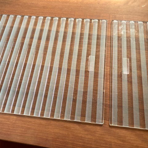 Har to små afslag, som ikke har betydning for brugen - rent kosmetisk, og ikke umiddelbart til at se, når glaslågen er placeret i skabet..