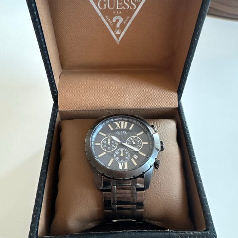 GUESS herre ur i sort stål med sort urskive og kronograf funktioner. Uret har en metalrem og en drejelig bezel med markeringer for minutter. Designet er robust og velegnet til daglig brug.