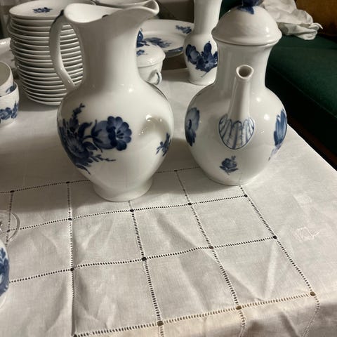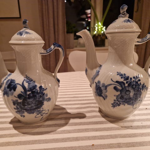4 stk Kaffekander Blå blomst kantet Royal Copenhagen. En med Micro afslag på tud som vist på foto, en i 2 sortering og to i 1 sortering. Prisen er pr stk eller tag dem alle for 900 kr