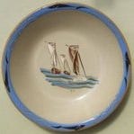 Tre charmerende fisketallerkener med blå kant og to større fisk på og fire mindre. De er med råhvid glasur og mønstret og fiskene er med lys og mørke blå farver.
