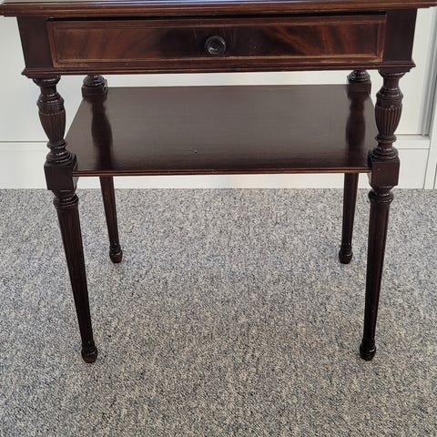 Upcycled nat- eller sidebord. Malet i en turkisblå farve, med bordplade i mahogni finér og masser af patina. Til den hyggelige stue, til nøglerne og huerne i gangen eller som enestående natbord i soveværelset 🪻🍄 🟫