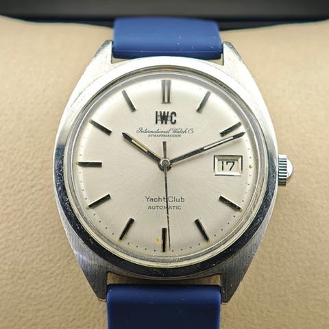 Stålkasse ca. 34–35 mm, plexiglas, original krone med IWC-fiskelogo.