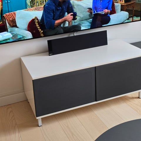 Gem anlæg og højttalere bag denne elegante stoflåge, som både slipper den gode lyd og fjernbetjening igennem. Flere farver.