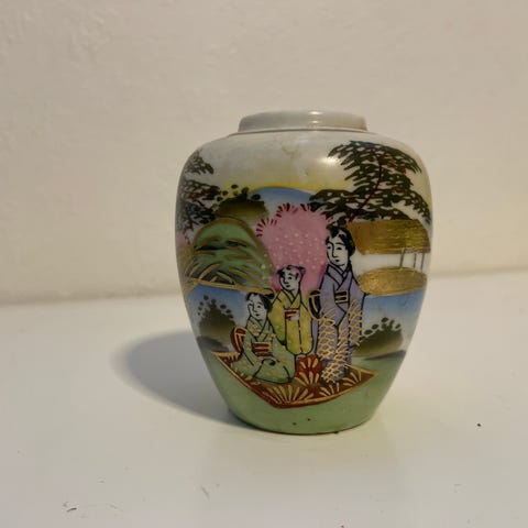 Noritake vase i keramik med håndmalede røde blomster og brune blade. Vasen har en rund form og en hvid basefarve. Den er dekoreret med et blomstermotiv og er velegnet til dekorative formål i hjemmet.