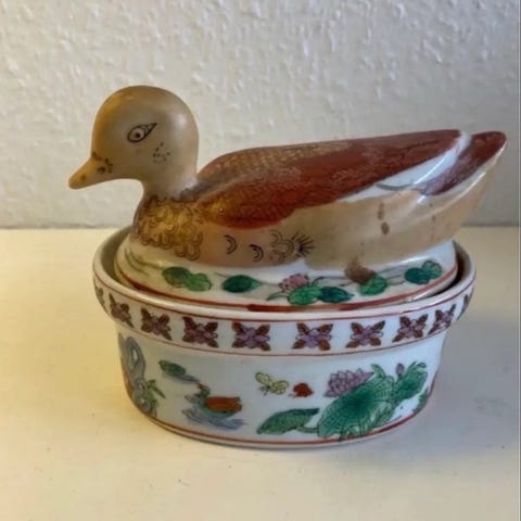 Brun rillet skål i midten er engelsk og på H: 8.4 x 16 cm 39,- og låget oveni passer til den franske lyse ovale skål med låg på 24 x 15 cm til blot 129,- (ekstra låg medfølger) og samme pris for den ovale låg skål helt til Venstre på 17 x 13.5 x H: 12 cm i perfekt stand og uden lufthul på låg
