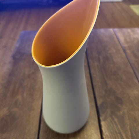 Stor kande til vand eller andet – rummer 1 liter. Støbt i indfarvet porcelæn og forarbejdet i hånden. Er glaseret indvendig og har en smuk mat vandslebet overflade udvendig. Tåler ifølge producenten maskinopvask og mikroovn. Fremstillet hos Ditte Fischer i København.