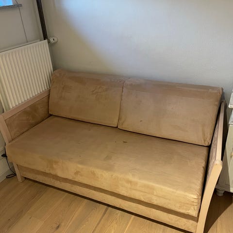Mål: H 91 x B 196 x D 98 cm. Sovemål, når sofaen er slået ud: 196 x 123 cm. Nypris 4486 kr.