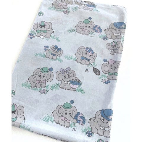 Sødeste retro dynebetræk i juniorstørrelse. Hvid baggrund med grå elefanter, fugle og grønne palmer. Mål på dynebetræk: 92x126cm. To meget små utydelige pletter, men ellers pænt med alle bindesnører.