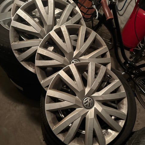 Hjulkapsler, Vw, 4 stk originale hjulkapsler til stålfælge. Oprindeligt siddet på golf 3. Passer også på golf nok. Ældre model. Maling er dårlig.
