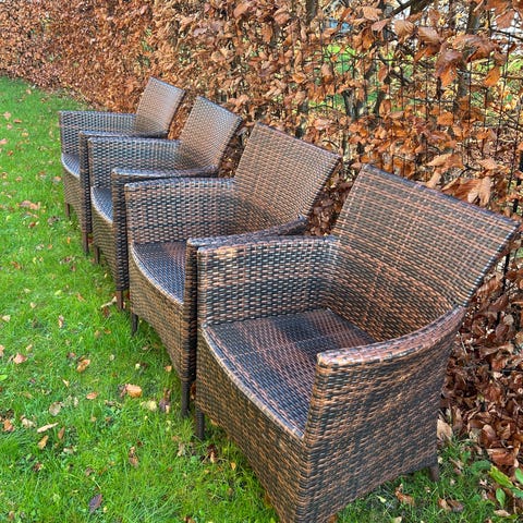 Abuela Sæt bestående af 6 havestole med stel i sort metal og sæde samt ryg i flett Stolene har armlæn og er designet til udendørs brug. Sættet er velegnet til have eller terrasse.koster 1300 kr stk sælges for 3400 samlet