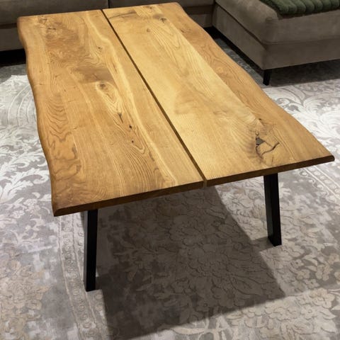 Sofabord fremstillet af genbrugsplanker. Bordpladetykkelse 2,5 cm. Understellet af lakeret metal (jern). Særdeles robust bord. Jeg har slebet det og givet det bordpladeolie, så det fremstår blødt og lækkert. Jeg sælger det kun, fordi det er for stort i min stue.