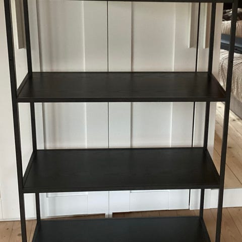 Sort moderne reol med hylder i et unikt design. Reolen har flere opbevaringsrum og en kombination af åbne hylder, der kan bruges til opbevaring af bøger, dekorationer eller elektronik.