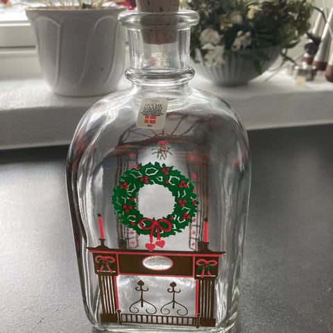 Holmegaard glasflaske med julemotiv, dekoreret med et krans- og stearinlysdesign. Flaske i klart glas, velegnet til opbevaring af væsker. Dekorationen er trykt på flasken og viser et traditionelt julebordsmotiv.