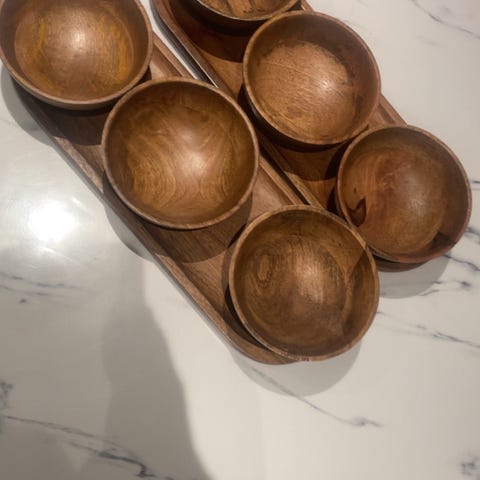 Smuk H&M Home rund træbakke med en diameter på 32 cm. Bakken er fremstillet af træ og har en naturlig træfarve. Velegnet til servering og dekoration.