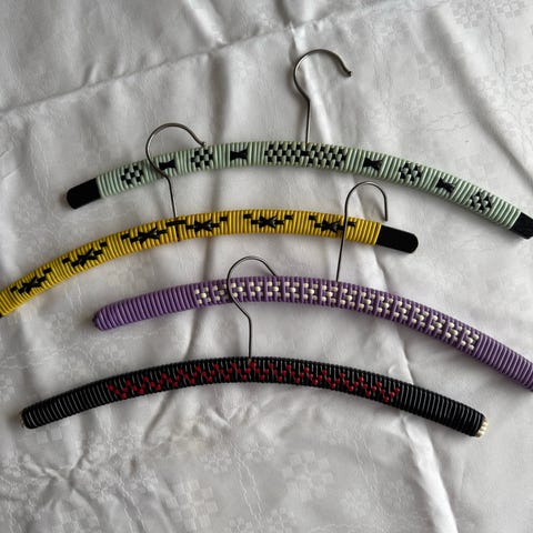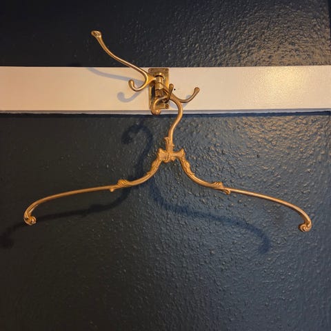 Bøjlerne har en bred form med kroge til ophængning af tøj. Materialet er messing med en antik finish.