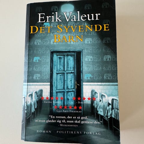 Erik Valeur Syvende Barn bog med illustrationer af blå elefanter på omslaget. Bogen indeholder tekst på dansk og er en trykt udgave med hårdt omslag.