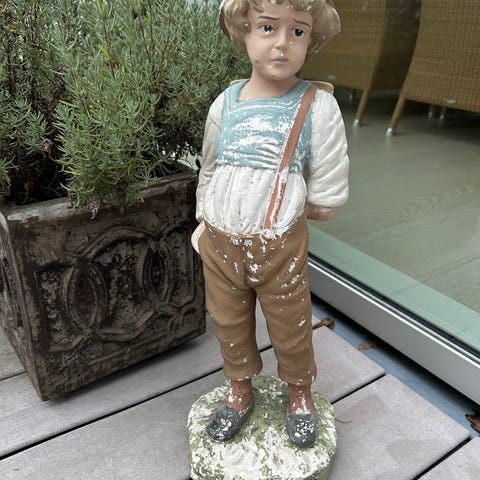 Fin gipsfigur af kvinde og mand stående på en oval fod.
