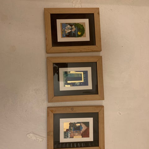 31x 37 cm. Indrammet kunstværk med abstrakte figurer i forskellige farver. Værket er monteret i en forgyldt træramme til ophæng på væggen. Passer til dekoration i hjem eller kontor.