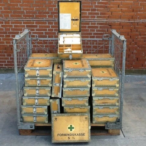 To militære ammunitionskasser i metal med rust og slidte overflader. Kasserne har låg med låsemekanisme og metalgreb. Indvendigt er kassernes bund og sider slidte og rustne. Kasserne er velegnede til opbevaring eller dekoration.har 2stk fine metalkasser L850 mm B 500 mm H 350 mm Byd Byd Byd